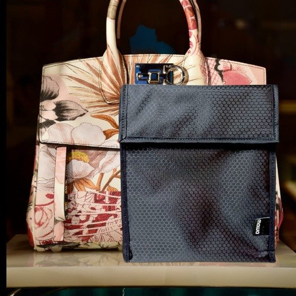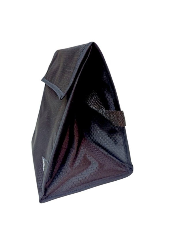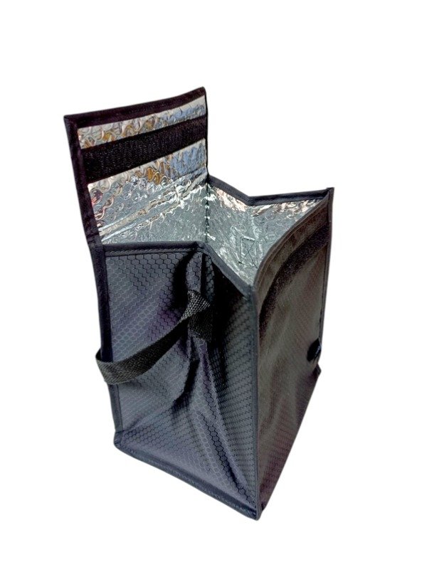 Confeccionada en tela cordura impermeable el parte externa y revestida con pólex aislante térmico burbuja en todo su interior. Ribeteada con al bies de color negro en todo su contorno. Con tira mochila para un mejor agarre.