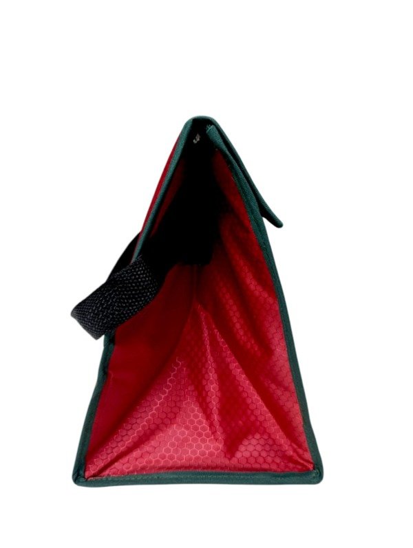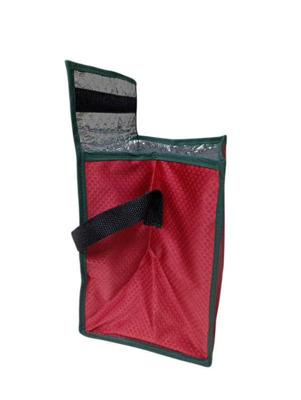 Confeccionada en tela cordura impermeable el parte externa y revestida con pólex aislante térmico burbuja en todo su interior. Ribeteada con al bies de color verde inglés en todo su contorno. Con tira mochila para un mejor agarre. Apta para plegarse y llevar cómodamente a todos lados.