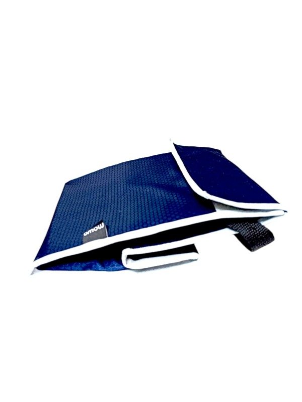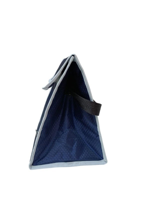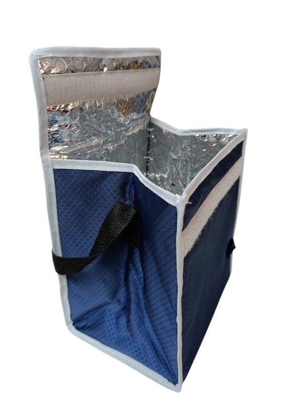 Confeccionada en tela cordura impermeable el parte externa y revestida con pólex aislante térmico burbuja en todo su interior. Ribeteada con al bies de color gris en todo su contorno. Con tira mochila para un mejor agarre.